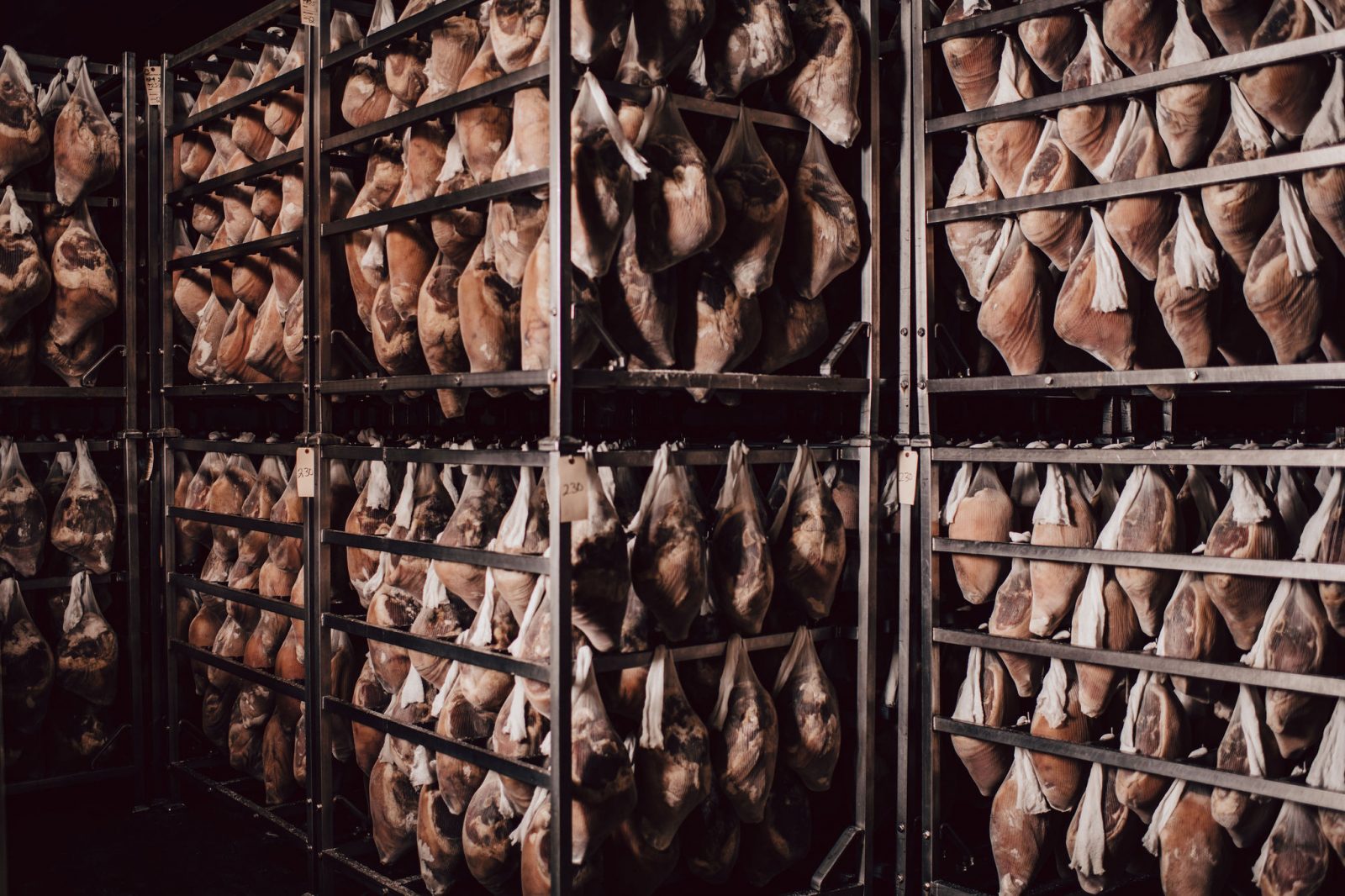The racks are placed in a simulated Spring time room. In this phase the hams start to dry, contributing to the gradual development of their flavors.