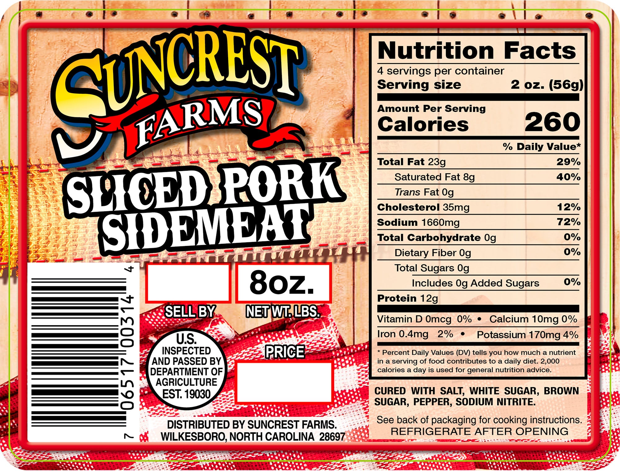 Suncrest Farms label featuring a USDA inspected seal and a nutrition facts label for sliced pork sidemeat.